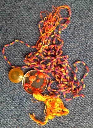 Heaven knows where I got the knitted ribbon from, but last night its time came. I spent an hour stuffing it with some orange threads I also didn't see myself using anywhere else - I know it was an hour because I was watching the Vuelta at the time, although the stuffing stopped when it got exciting.