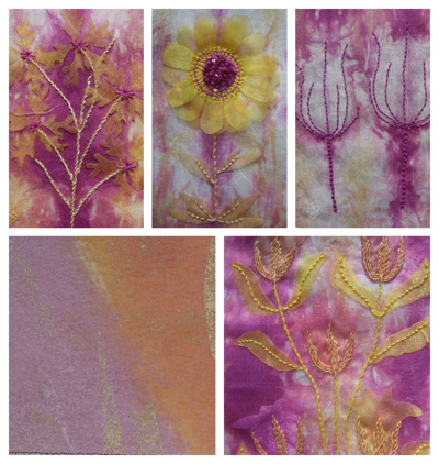Bottom left shows how the Lynda Monk treatment of the Vilene turned out. It isn't quite as vibrant as I'd expected, perhaps because I didn't quite have the right materials. However, muted is probably better.